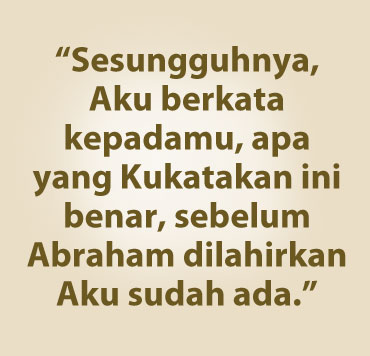 "Bapamu Abraham bersukacita melihat hari-Ku. Dia melihatnya dan bergembira.” Orang Yahudi berkata kepada-Nya, “Usia-Mu belum sampai lima puluh tahun. Bagaimana Kamu mungkin berjumpa dengan Abraham?” Yesus berkata kepada mereka, “Sesungguhnya, Aku berkata kepadamu, apa yang Kukatakan ini benar, sebelum Abraham dilahirkan Aku sudah ada."4